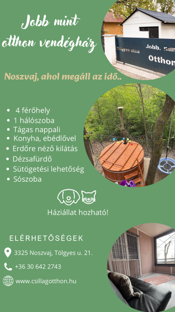 A Jobb mint Otthon Vendégház Noszvaj egyik legszebb részén, Síkfőkút festői környezetében található. A különálló, modern, mégis otthonos kialakítású vendégház tökéletes választás azok számára, akik nyugodt, természetközeli pihenésre vágynak. A ház kényelmes elrendezése és saját wellness lehetőségei garantálják a kikapcsolódást, legyen szó családi nyaralásról, baráti összejövetelről vagy romantikus hétvégéről.